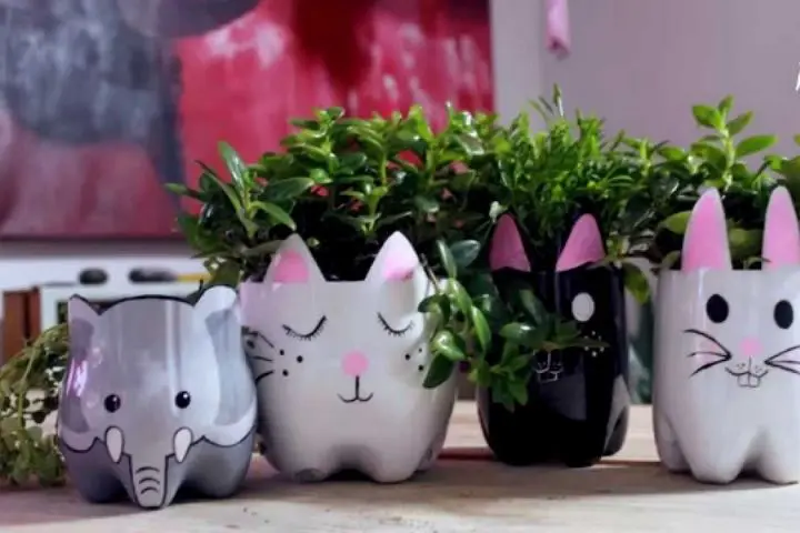 Y lo mas importante al momento de hacer manualidades con botellas plásticas, silicona fría y detalles como , ojos, cabellos, manitos, hilos y cintas de colores, y todo lo que consideres necesario para darle vida y belleza a tus macetas con botellas.